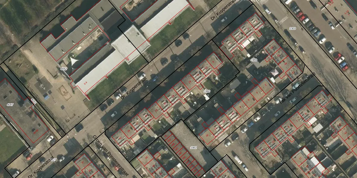 Het perceel waarop Dr. Kuyperstraat 17 staat heeft een oppervlakte van 1900 m². Dit is een zeer groot perceel. De perceeloppervlakte wordt geregistreerd door het Kadaster. Gedetailleerde informatie over de maten van dit perceel kunt u vinden in het rapport Kadastrale kaart met maatvoering van Dr. Kuyperstraat 17.