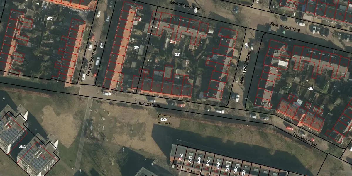 Het perceel waarop Dunklerstraat 15 staat heeft een oppervlakte van 2510 m². Dit is een zeer groot perceel. De perceeloppervlakte wordt geregistreerd door het Kadaster. Gedetailleerde informatie over de maten van dit perceel kunt u vinden in het rapport Kadastrale kaart met maatvoering van Dunklerstraat 15.