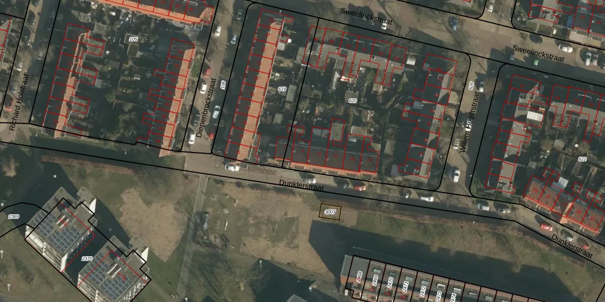 Het perceel waarop Dunklerstraat 9 staat heeft een oppervlakte van 2510 m². Dit is een zeer groot perceel. De perceeloppervlakte wordt geregistreerd door het Kadaster. Gedetailleerde informatie over de maten van dit perceel kunt u vinden in het rapport Kadastrale kaart met maatvoering van Dunklerstraat 9.