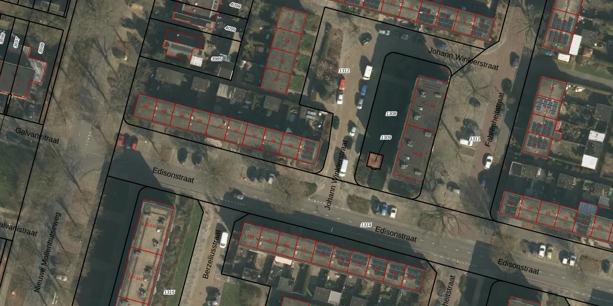 Het perceel waarop Edisonstraat 32 staat heeft een oppervlakte van 7429 m². Dit is een zeer groot perceel. De perceeloppervlakte wordt geregistreerd door het Kadaster. Gedetailleerde informatie over de maten van dit perceel kunt u vinden in het rapport Kadastrale kaart met maatvoering van Edisonstraat 32.