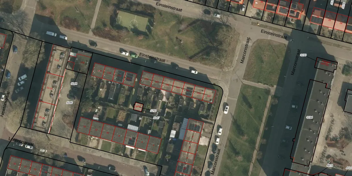 Het perceel waarop Einsteinstraat 163 staat heeft een oppervlakte van 5147 m². Dit is een zeer groot perceel. De perceeloppervlakte wordt geregistreerd door het Kadaster. Gedetailleerde informatie over de maten van dit perceel kunt u vinden in het rapport Kadastrale kaart met maatvoering van Einsteinstraat 163.