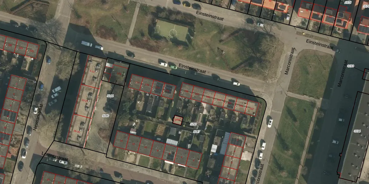 Het perceel waarop Einsteinstraat 169 staat heeft een oppervlakte van 5147 m². Dit is een zeer groot perceel. De perceeloppervlakte wordt geregistreerd door het Kadaster. Gedetailleerde informatie over de maten van dit perceel kunt u vinden in het rapport Kadastrale kaart met maatvoering van Einsteinstraat 169.