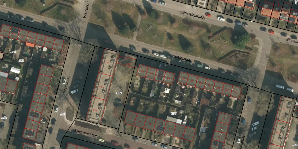 Het perceel waarop Einsteinstraat 199 staat heeft een oppervlakte van 5175 m². Dit is een zeer groot perceel. De perceeloppervlakte wordt geregistreerd door het Kadaster. Gedetailleerde informatie over de maten van dit perceel kunt u vinden in het rapport Kadastrale kaart met maatvoering van Einsteinstraat 199.