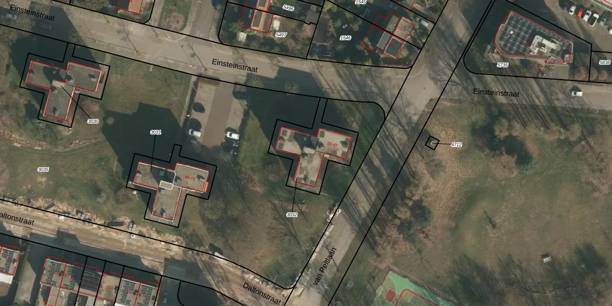Het perceel waarop Einsteinstraat 37 staat heeft een oppervlakte van 432 m². Dit is een groot perceel. De perceeloppervlakte wordt geregistreerd door het Kadaster. Gedetailleerde informatie over de maten van dit perceel kunt u vinden in het rapport Kadastrale kaart met maatvoering van Einsteinstraat 37.