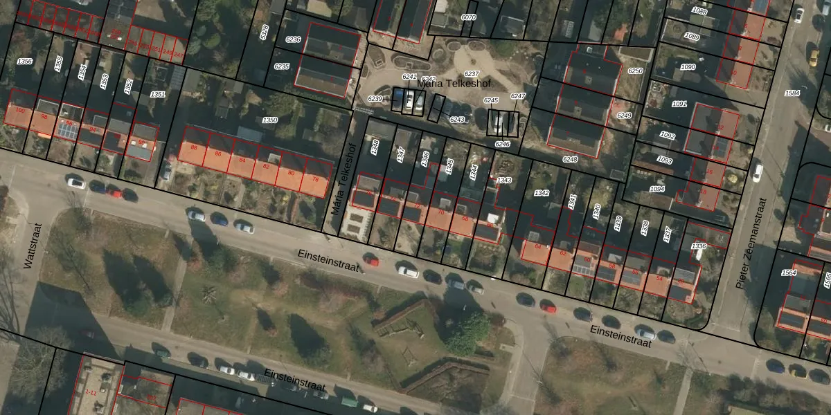 Het perceel waarop Einsteinstraat 72 staat heeft een oppervlakte van 180 m². Dit is een middelgroot perceel. De perceeloppervlakte wordt geregistreerd door het Kadaster. Gedetailleerde informatie over de maten van dit perceel kunt u vinden in het rapport Kadastrale kaart met maatvoering van Einsteinstraat 72.