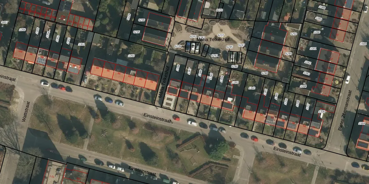 Het perceel waarop Einsteinstraat 74 staat heeft een oppervlakte van 180 m². Dit is een middelgroot perceel. De perceeloppervlakte wordt geregistreerd door het Kadaster. Gedetailleerde informatie over de maten van dit perceel kunt u vinden in het rapport Kadastrale kaart met maatvoering van Einsteinstraat 74.