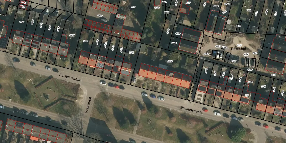 Het perceel waarop Einsteinstraat 88 staat heeft een oppervlakte van 1235 m². Dit is een zeer groot perceel. De perceeloppervlakte wordt geregistreerd door het Kadaster. Gedetailleerde informatie over de maten van dit perceel kunt u vinden in het rapport Kadastrale kaart met maatvoering van Einsteinstraat 88.