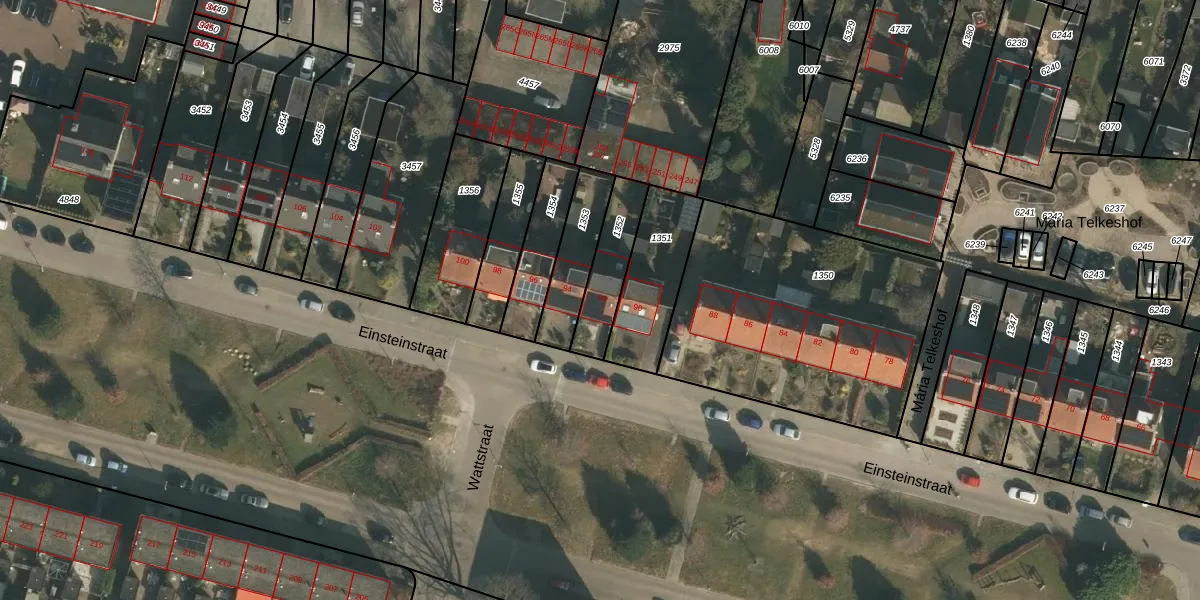 Het perceel waarop Einsteinstraat 92 staat heeft een oppervlakte van 181 m². Dit is een middelgroot perceel. De perceeloppervlakte wordt geregistreerd door het Kadaster. Gedetailleerde informatie over de maten van dit perceel kunt u vinden in het rapport Kadastrale kaart met maatvoering van Einsteinstraat 92.