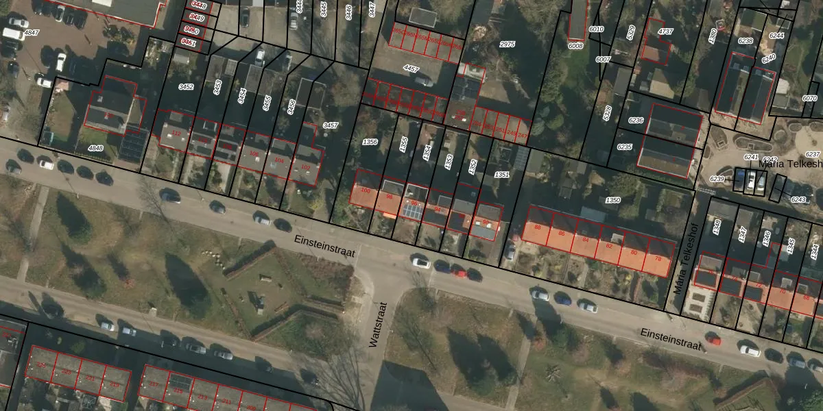 Het perceel waarop Einsteinstraat 96 staat heeft een oppervlakte van 181 m². Dit is een middelgroot perceel. De perceeloppervlakte wordt geregistreerd door het Kadaster. Gedetailleerde informatie over de maten van dit perceel kunt u vinden in het rapport Kadastrale kaart met maatvoering van Einsteinstraat 96.