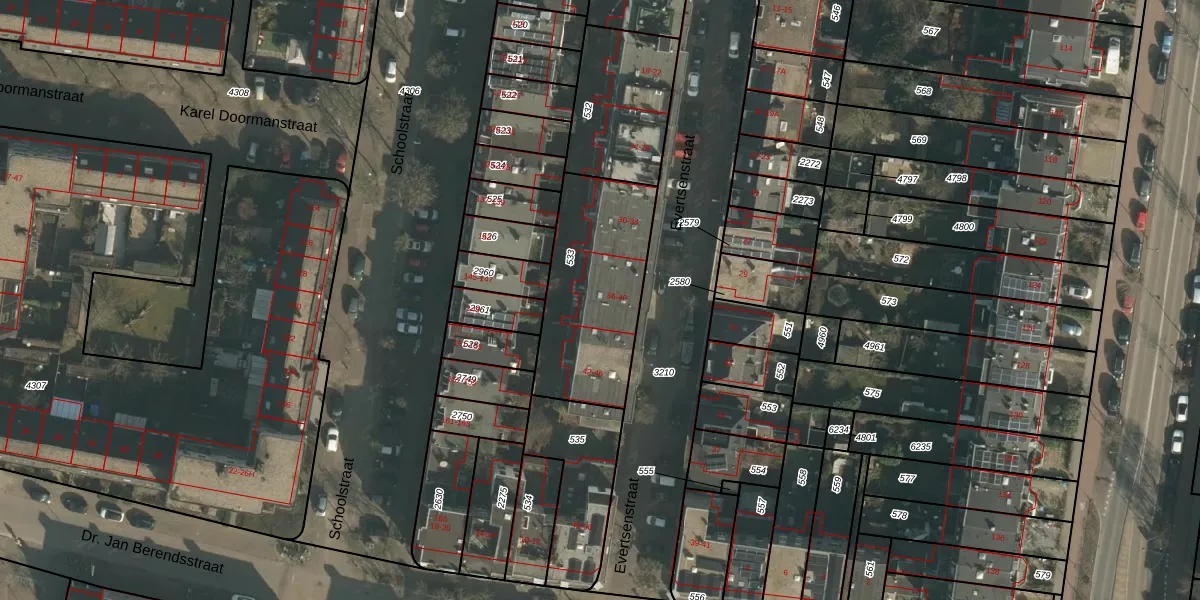 Het perceel waarop Evertsenstraat 36 staat heeft een oppervlakte van 584 m². Dit is een groot perceel. De perceeloppervlakte wordt geregistreerd door het Kadaster. Gedetailleerde informatie over de maten van dit perceel kunt u vinden in het rapport Kadastrale kaart met maatvoering van Evertsenstraat 36.