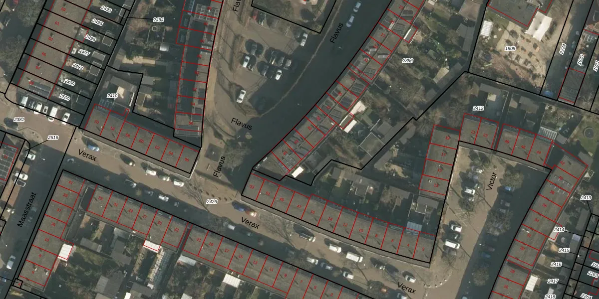 Het perceel waarop Flavus 43 staat heeft een oppervlakte van 2467 m². Dit is een zeer groot perceel. De perceeloppervlakte wordt geregistreerd door het Kadaster. Gedetailleerde informatie over de maten van dit perceel kunt u vinden in het rapport Kadastrale kaart met maatvoering van Flavus 43.