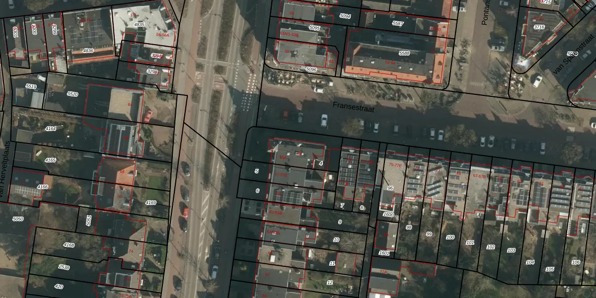 Het perceel waarop Fransestraat 83 staat heeft een oppervlakte van 378 m². Dit is een groot perceel. De perceeloppervlakte wordt geregistreerd door het Kadaster. Gedetailleerde informatie over de maten van dit perceel kunt u vinden in het rapport Kadastrale kaart met maatvoering van Fransestraat 83.