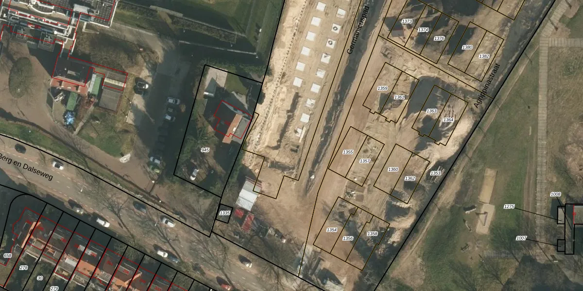 Het perceel waarop Germanicuspad 13 staat heeft een oppervlakte van 3168 m². Dit is een zeer groot perceel. De perceeloppervlakte wordt geregistreerd door het Kadaster. Gedetailleerde informatie over de maten van dit perceel kunt u vinden in het rapport Kadastrale kaart met maatvoering van Germanicuspad 13.