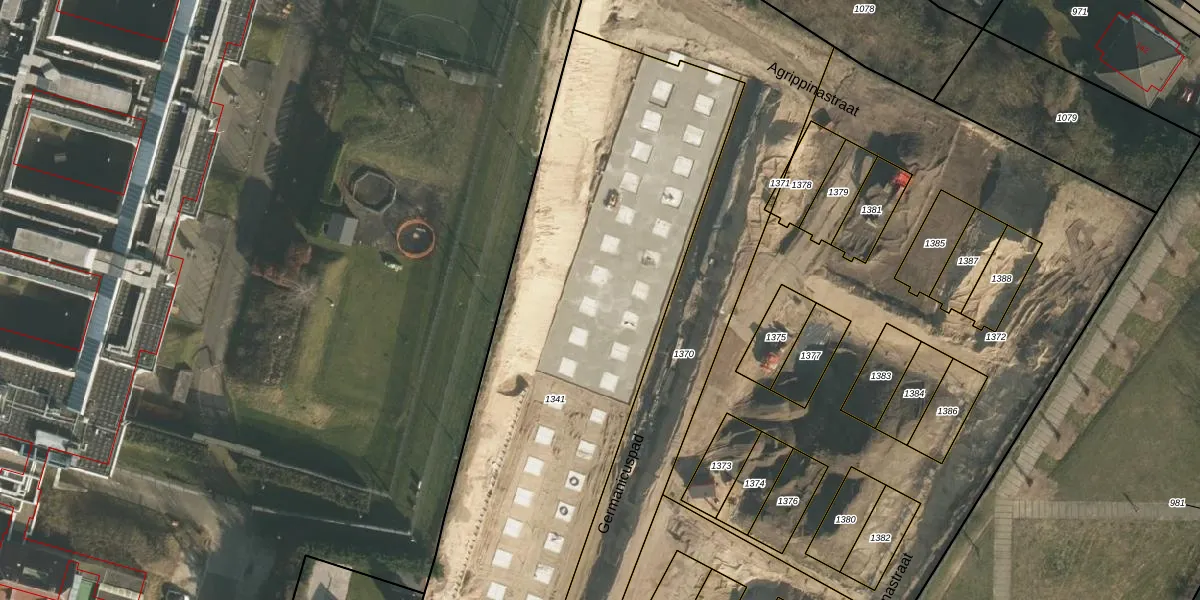 Het perceel waarop Germanicuspad 55 staat heeft een oppervlakte van 3168 m². Dit is een zeer groot perceel. De perceeloppervlakte wordt geregistreerd door het Kadaster. Gedetailleerde informatie over de maten van dit perceel kunt u vinden in het rapport Kadastrale kaart met maatvoering van Germanicuspad 55.