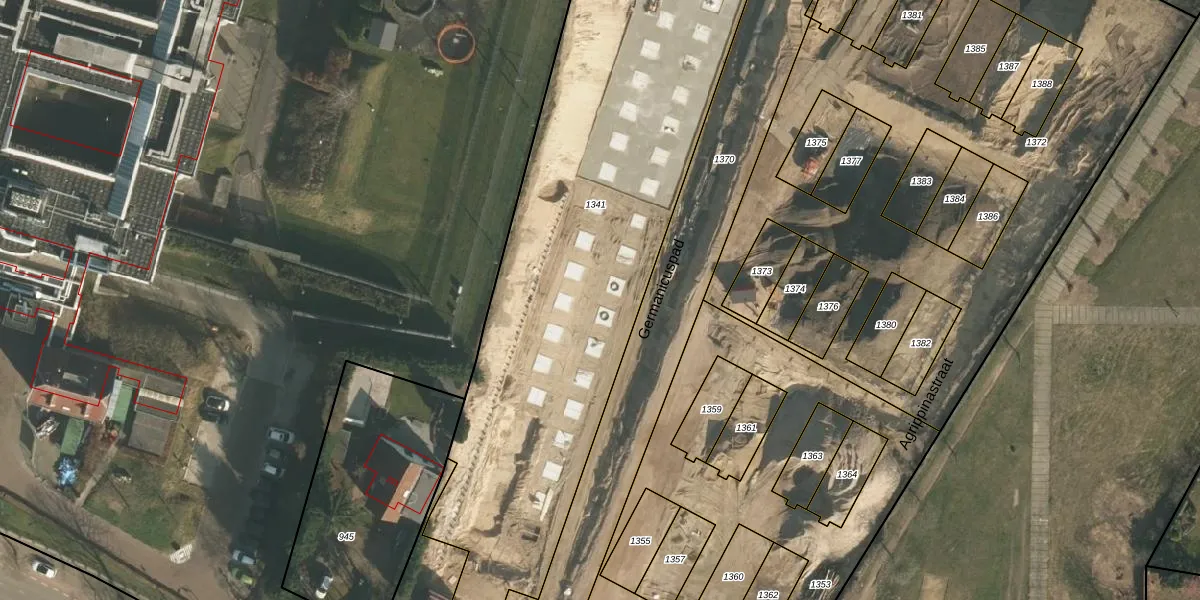Het perceel waarop Germanicuspad 9 staat heeft een oppervlakte van 3168 m². Dit is een zeer groot perceel. De perceeloppervlakte wordt geregistreerd door het Kadaster. Gedetailleerde informatie over de maten van dit perceel kunt u vinden in het rapport Kadastrale kaart met maatvoering van Germanicuspad 9.