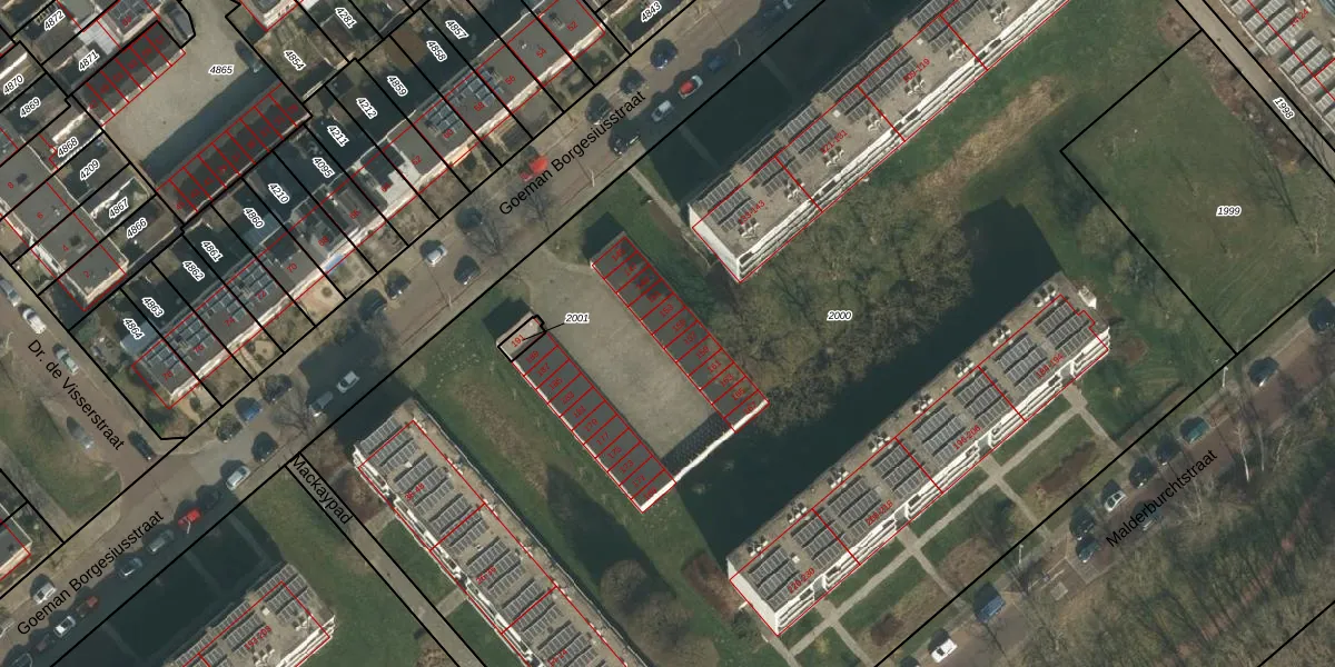 Het perceel waarop Goeman Borgesiusstraat 155 staat heeft een oppervlakte van 1,0 ha. Dit is een zeer groot perceel. De perceeloppervlakte wordt geregistreerd door het Kadaster. Gedetailleerde informatie over de maten van dit perceel kunt u vinden in het rapport Kadastrale kaart met maatvoering van Goeman Borgesiusstraat 155.
