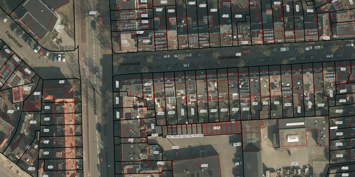 Het perceel waarop Gorisstraat 63 staat heeft een oppervlakte van 180 m². Dit is een middelgroot perceel. De perceeloppervlakte wordt geregistreerd door het Kadaster. Gedetailleerde informatie over de maten van dit perceel kunt u vinden in het rapport Kadastrale kaart met maatvoering van Gorisstraat 63.