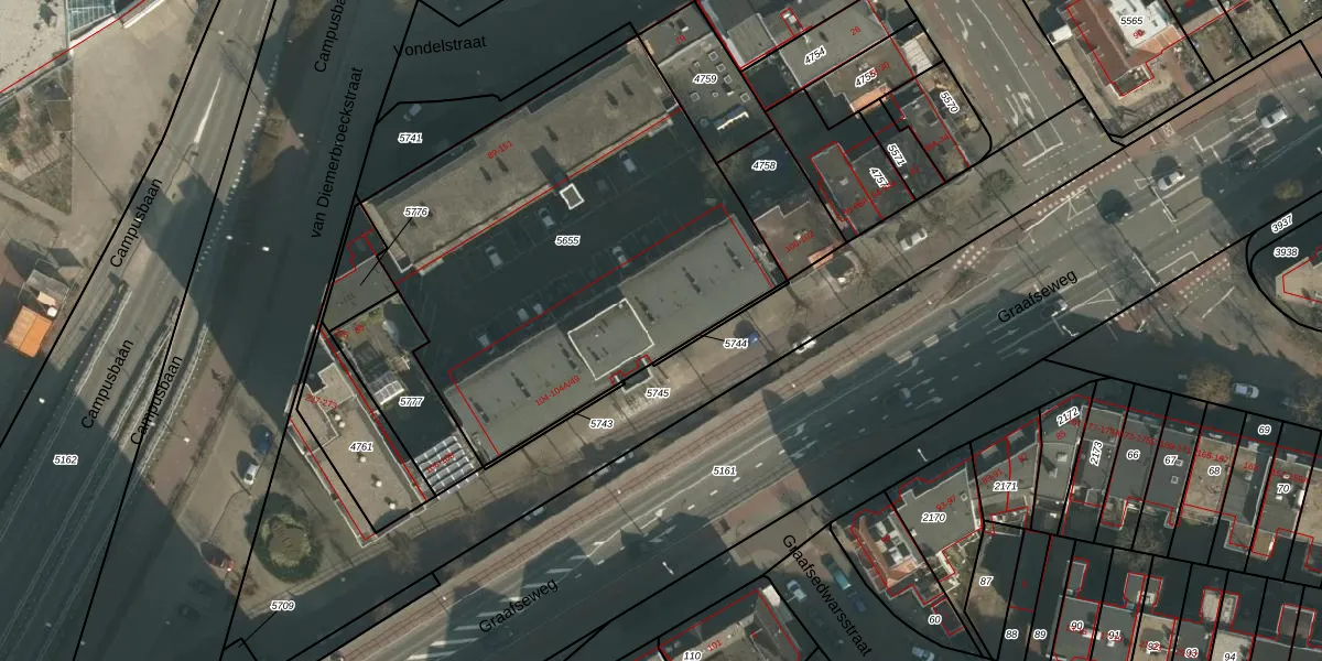 Het perceel waarop Graafseweg 104-A-8 staat heeft een oppervlakte van 2300 m². Dit is een zeer groot perceel. De perceeloppervlakte wordt geregistreerd door het Kadaster. Gedetailleerde informatie over de maten van dit perceel kunt u vinden in het rapport Kadastrale kaart met maatvoering van Graafseweg 104-A-8.