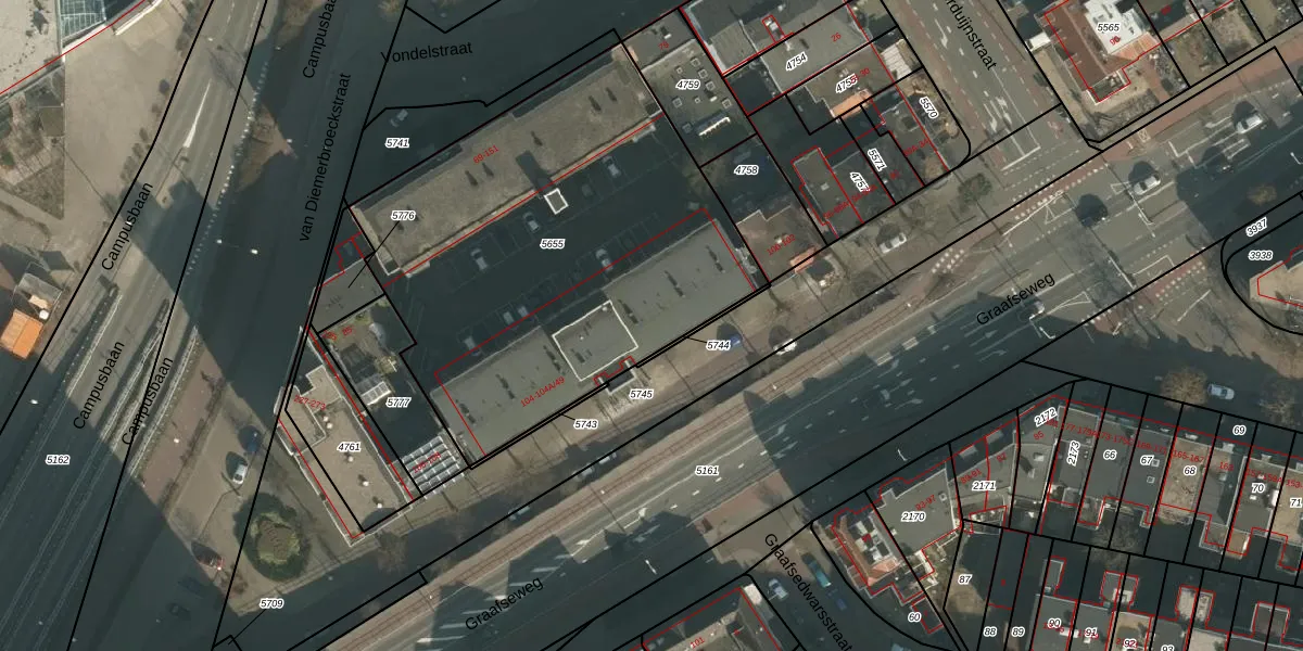 Het perceel waarop Graafseweg 104-A-20 staat heeft een oppervlakte van 2300 m². Dit is een zeer groot perceel. De perceeloppervlakte wordt geregistreerd door het Kadaster. Gedetailleerde informatie over de maten van dit perceel kunt u vinden in het rapport Kadastrale kaart met maatvoering van Graafseweg 104-A-20.