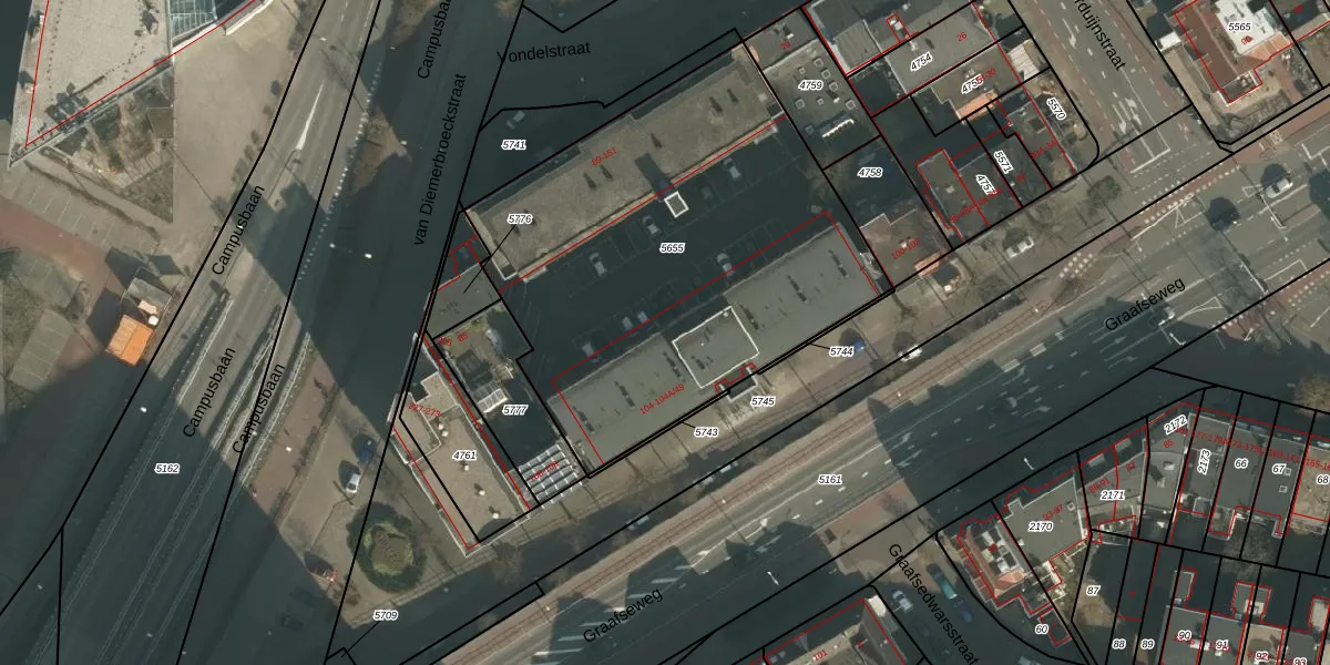 Het perceel waarop Graafseweg 104-A-43 staat heeft een oppervlakte van 2300 m². Dit is een zeer groot perceel. De perceeloppervlakte wordt geregistreerd door het Kadaster. Gedetailleerde informatie over de maten van dit perceel kunt u vinden in het rapport Kadastrale kaart met maatvoering van Graafseweg 104-A-43.