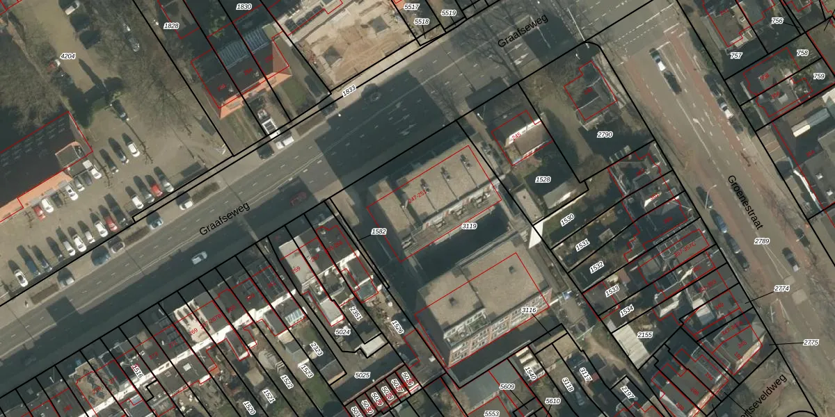 Het perceel waarop Graafseweg 247-N staat heeft een oppervlakte van 2229 m². Dit is een zeer groot perceel. De perceeloppervlakte wordt geregistreerd door het Kadaster. Gedetailleerde informatie over de maten van dit perceel kunt u vinden in het rapport Kadastrale kaart met maatvoering van Graafseweg 247-N.