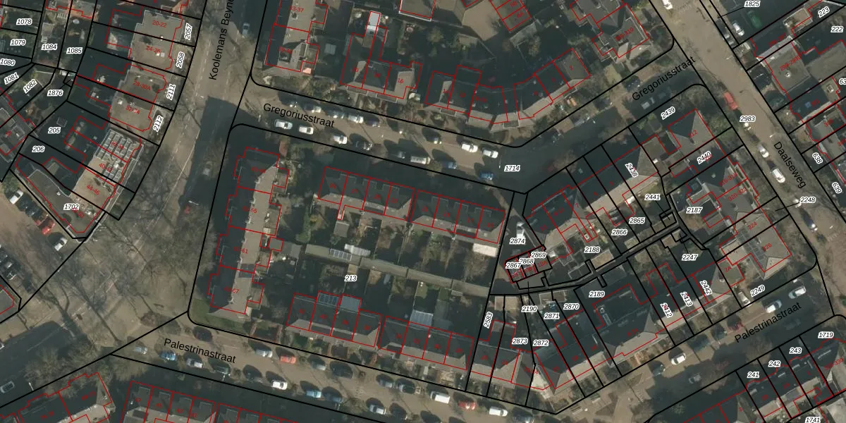Gregoriusstraat 21 is gelegen op kadastraal perceel HTT02H213. Deze kadastrale aanduiding is uniek en wordt gebruikt door het Kadaster om eigendomsrechten en andere zakelijke rechten vast te leggen. Het perceel maakt onderdeel uit van de kadastrale gemeente Hatert.