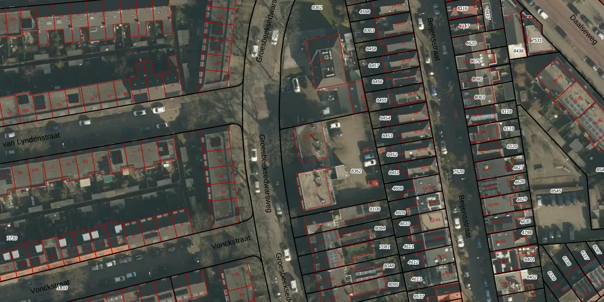 Groesbeeksedwarsweg 25-C is gelegen op kadastraal perceel HTT02A8362. Deze kadastrale aanduiding is uniek en wordt gebruikt door het Kadaster om eigendomsrechten en andere zakelijke rechten vast te leggen. Het perceel maakt onderdeel uit van de kadastrale gemeente Hatert.