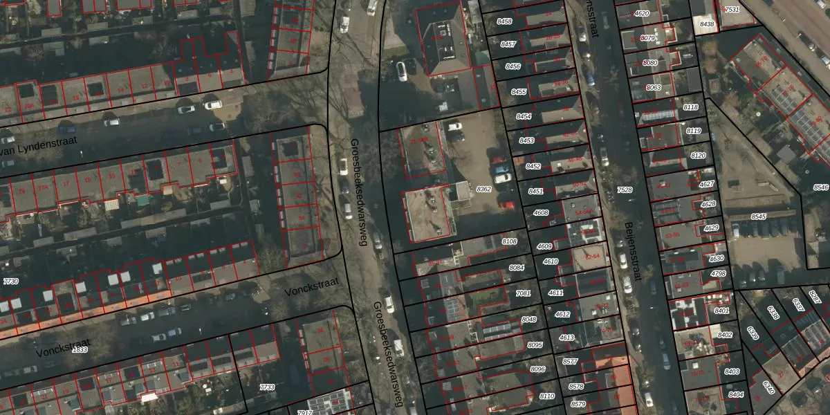 Het perceel waarop Groesbeeksedwarsweg 33 staat heeft een oppervlakte van 943 m². Dit is een groot perceel. De perceeloppervlakte wordt geregistreerd door het Kadaster. Gedetailleerde informatie over de maten van dit perceel kunt u vinden in het rapport Kadastrale kaart met maatvoering van Groesbeeksedwarsweg 33.