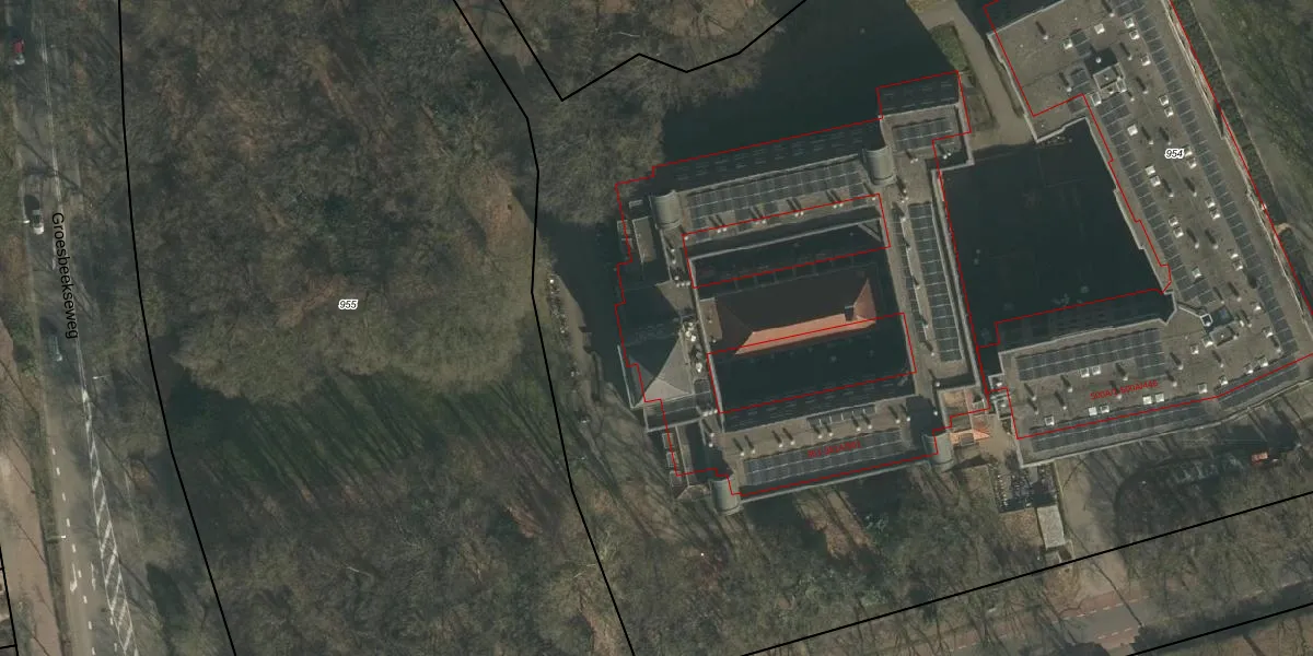 Het perceel waarop Groesbeekseweg 351 staat heeft een oppervlakte van 1,9 ha. Dit is een zeer groot perceel. De perceeloppervlakte wordt geregistreerd door het Kadaster. Gedetailleerde informatie over de maten van dit perceel kunt u vinden in het rapport Kadastrale kaart met maatvoering van Groesbeekseweg 351.