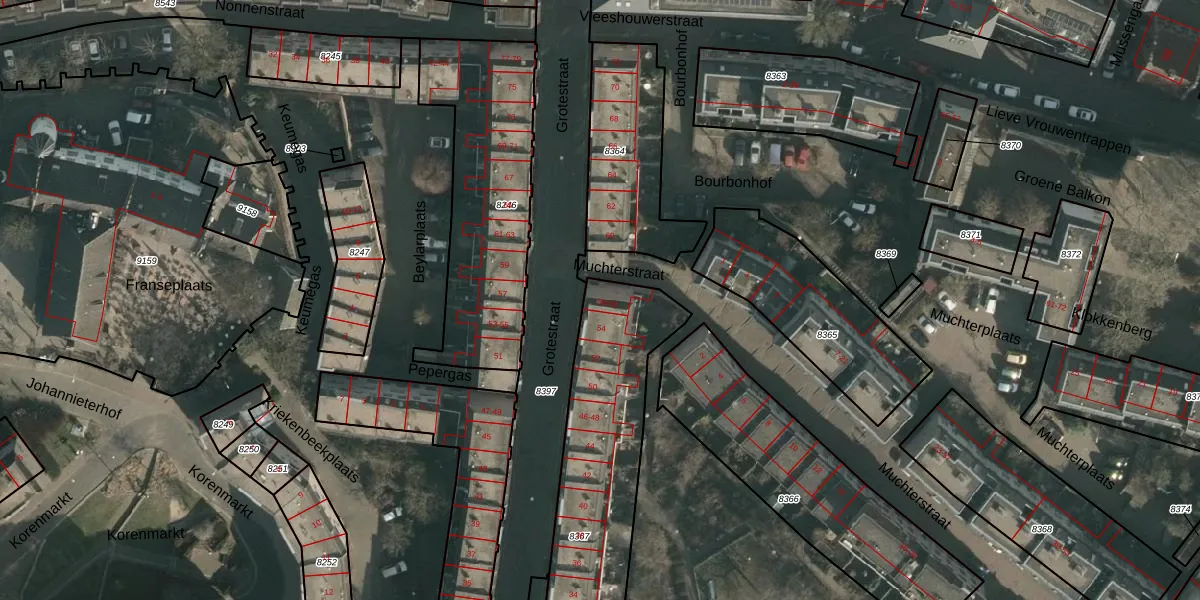 Grotestraat 56 is gelegen op kadastraal perceel NMG00C8367. Deze kadastrale aanduiding is uniek en wordt gebruikt door het Kadaster om eigendomsrechten en andere zakelijke rechten vast te leggen. Het perceel maakt onderdeel uit van de kadastrale gemeente Nijmegen.