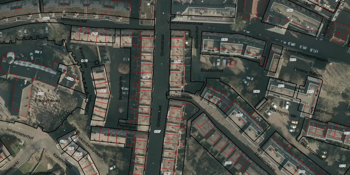 Grotestraat 60 is gelegen op kadastraal perceel NMG00C8364. Deze kadastrale aanduiding is uniek en wordt gebruikt door het Kadaster om eigendomsrechten en andere zakelijke rechten vast te leggen. Het perceel maakt onderdeel uit van de kadastrale gemeente Nijmegen.
