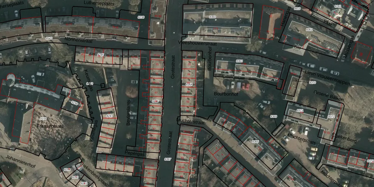 Grotestraat 64 is gelegen op kadastraal perceel NMG00C8364. Deze kadastrale aanduiding is uniek en wordt gebruikt door het Kadaster om eigendomsrechten en andere zakelijke rechten vast te leggen. Het perceel maakt onderdeel uit van de kadastrale gemeente Nijmegen.
