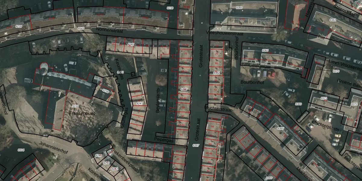 Grotestraat 65 is gelegen op kadastraal perceel NMG00C8246. Deze kadastrale aanduiding is uniek en wordt gebruikt door het Kadaster om eigendomsrechten en andere zakelijke rechten vast te leggen. Het perceel maakt onderdeel uit van de kadastrale gemeente Nijmegen.