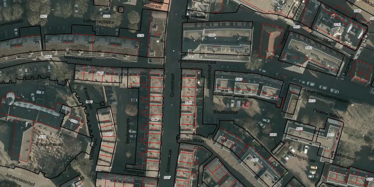 Grotestraat 68 is gelegen op kadastraal perceel NMG00C8364. Deze kadastrale aanduiding is uniek en wordt gebruikt door het Kadaster om eigendomsrechten en andere zakelijke rechten vast te leggen. Het perceel maakt onderdeel uit van de kadastrale gemeente Nijmegen.