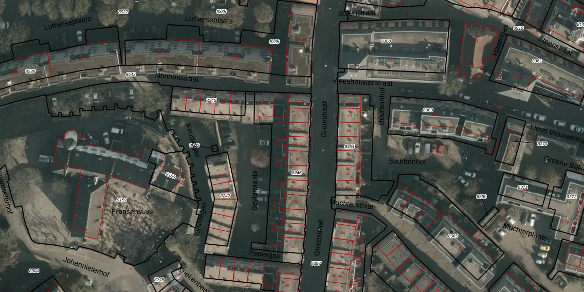 Grotestraat 71 is gelegen op kadastraal perceel NMG00C8246. Deze kadastrale aanduiding is uniek en wordt gebruikt door het Kadaster om eigendomsrechten en andere zakelijke rechten vast te leggen. Het perceel maakt onderdeel uit van de kadastrale gemeente Nijmegen.