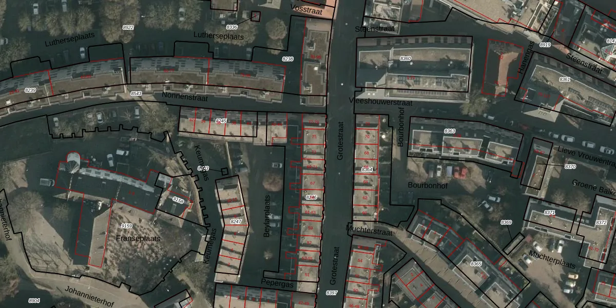 Grotestraat 73 is gelegen op kadastraal perceel NMG00C8246. Deze kadastrale aanduiding is uniek en wordt gebruikt door het Kadaster om eigendomsrechten en andere zakelijke rechten vast te leggen. Het perceel maakt onderdeel uit van de kadastrale gemeente Nijmegen.