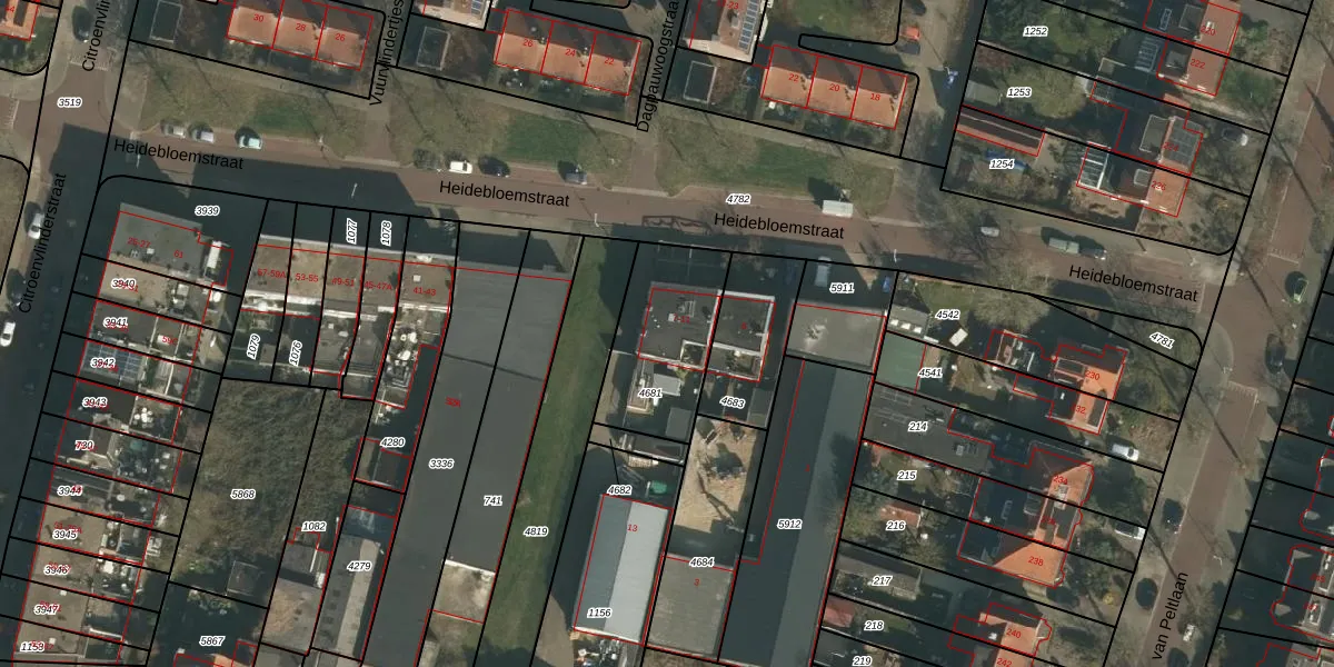 Het perceel waarop Heidebloemstraat 7 staat heeft een oppervlakte van 417 m². Dit is een groot perceel. De perceeloppervlakte wordt geregistreerd door het Kadaster. Gedetailleerde informatie over de maten van dit perceel kunt u vinden in het rapport Kadastrale kaart met maatvoering van Heidebloemstraat 7.