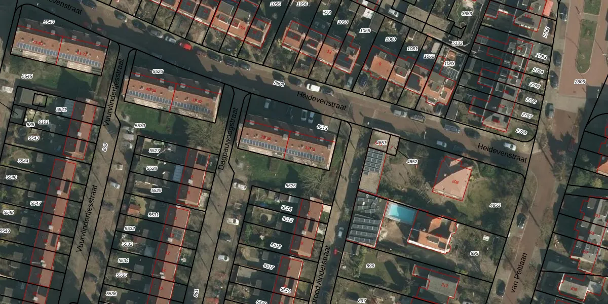 Het perceel waarop Heidevenstraat 21 staat heeft een oppervlakte van 555 m². Dit is een groot perceel. De perceeloppervlakte wordt geregistreerd door het Kadaster. Gedetailleerde informatie over de maten van dit perceel kunt u vinden in het rapport Kadastrale kaart met maatvoering van Heidevenstraat 21.