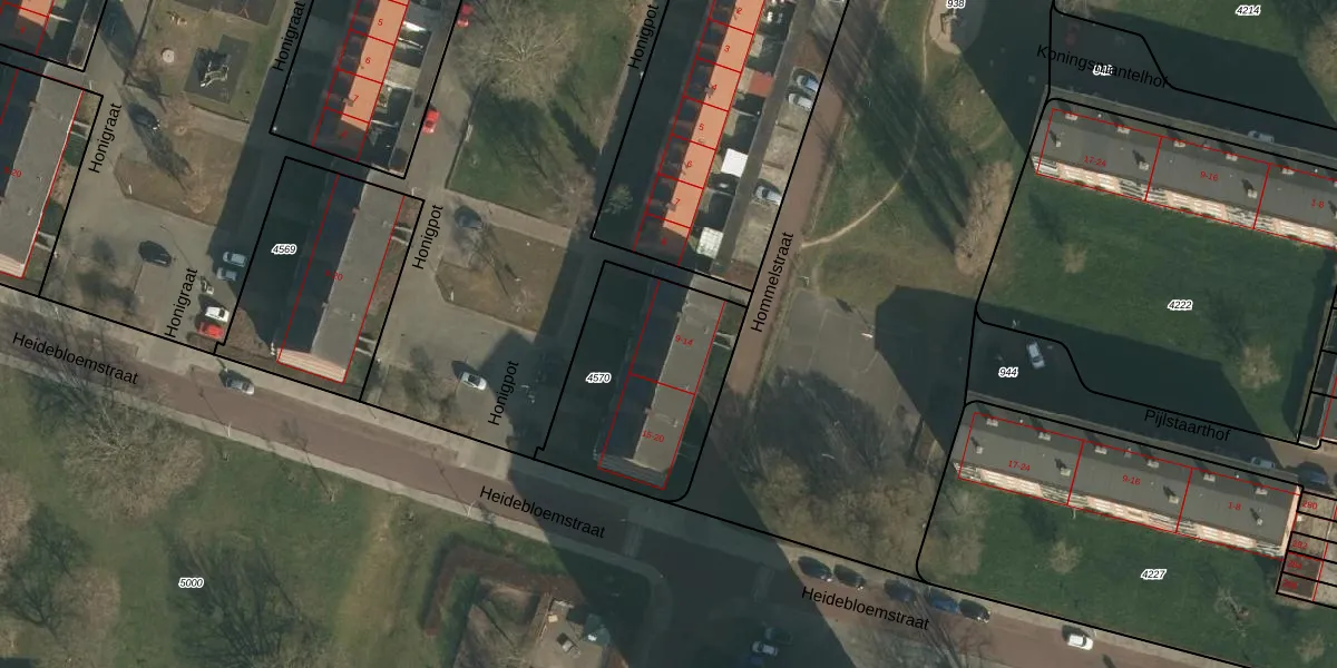 Het perceel waarop Honigpot 11 staat heeft een oppervlakte van 699 m². Dit is een groot perceel. De perceeloppervlakte wordt geregistreerd door het Kadaster. Gedetailleerde informatie over de maten van dit perceel kunt u vinden in het rapport Kadastrale kaart met maatvoering van Honigpot 11.