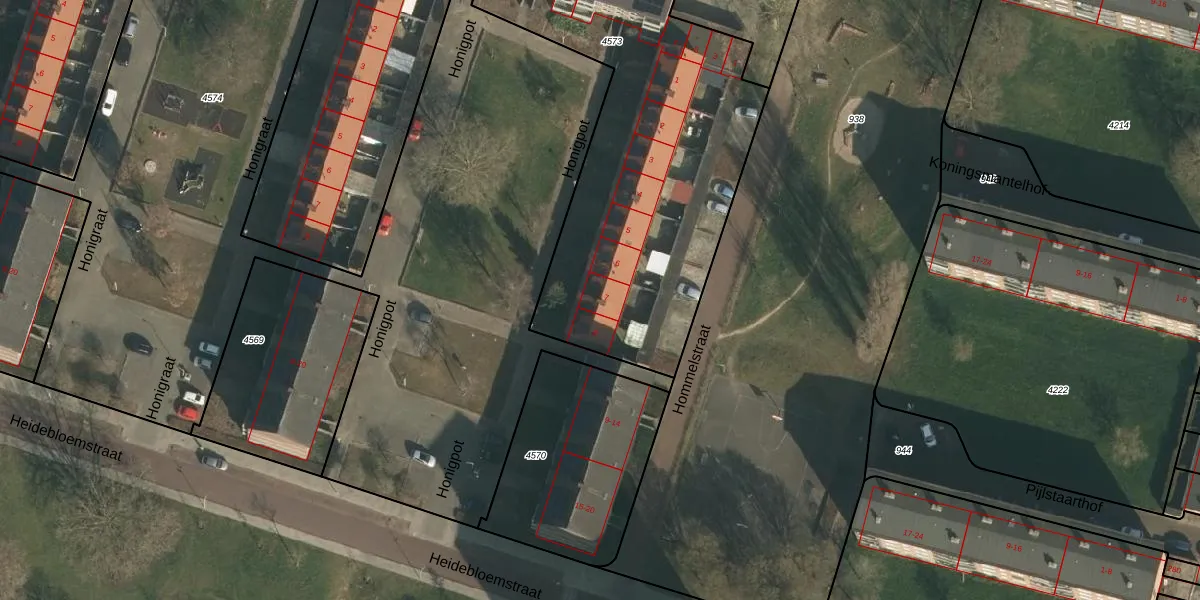 Het perceel waarop Honigpot 7 staat heeft een oppervlakte van 1941 m². Dit is een zeer groot perceel. De perceeloppervlakte wordt geregistreerd door het Kadaster. Gedetailleerde informatie over de maten van dit perceel kunt u vinden in het rapport Kadastrale kaart met maatvoering van Honigpot 7.
