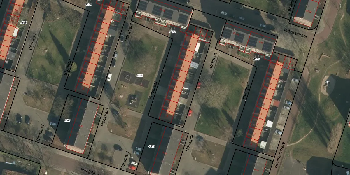 Het perceel waarop Honigraat 5 staat heeft een oppervlakte van 1712 m². Dit is een zeer groot perceel. De perceeloppervlakte wordt geregistreerd door het Kadaster. Gedetailleerde informatie over de maten van dit perceel kunt u vinden in het rapport Kadastrale kaart met maatvoering van Honigraat 5.