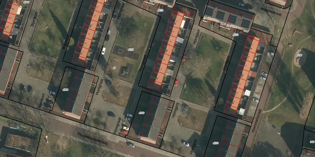 Het perceel waarop Honigraat 7 staat heeft een oppervlakte van 1712 m². Dit is een zeer groot perceel. De perceeloppervlakte wordt geregistreerd door het Kadaster. Gedetailleerde informatie over de maten van dit perceel kunt u vinden in het rapport Kadastrale kaart met maatvoering van Honigraat 7.