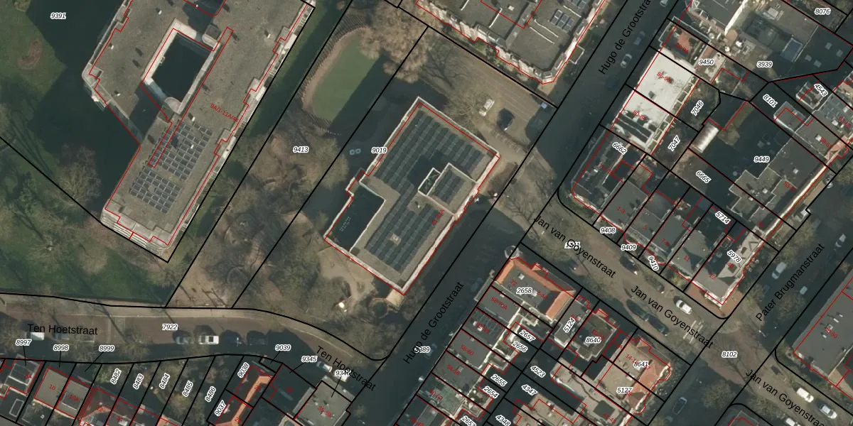 Het perceel waarop Hugo de Grootstraat 41 staat heeft een oppervlakte van 2705 m². Dit is een zeer groot perceel. De perceeloppervlakte wordt geregistreerd door het Kadaster. Gedetailleerde informatie over de maten van dit perceel kunt u vinden in het rapport Kadastrale kaart met maatvoering van Hugo de Grootstraat 41.