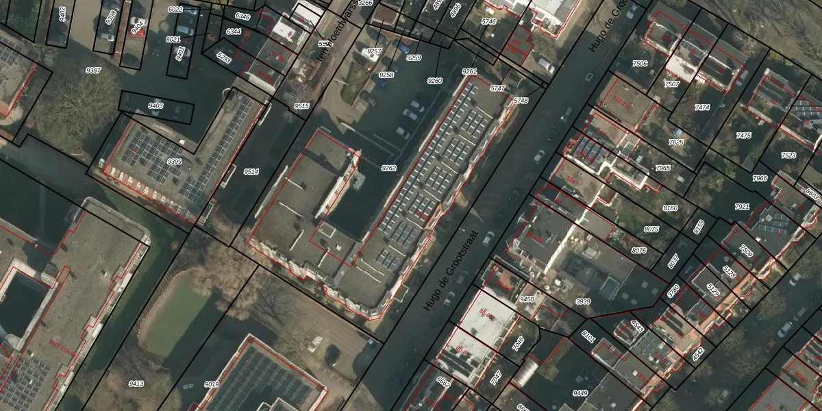 Het perceel waarop Hugo de Grootstraat 81 staat heeft een oppervlakte van 3130 m². Dit is een zeer groot perceel. De perceeloppervlakte wordt geregistreerd door het Kadaster. Gedetailleerde informatie over de maten van dit perceel kunt u vinden in het rapport Kadastrale kaart met maatvoering van Hugo de Grootstraat 81.