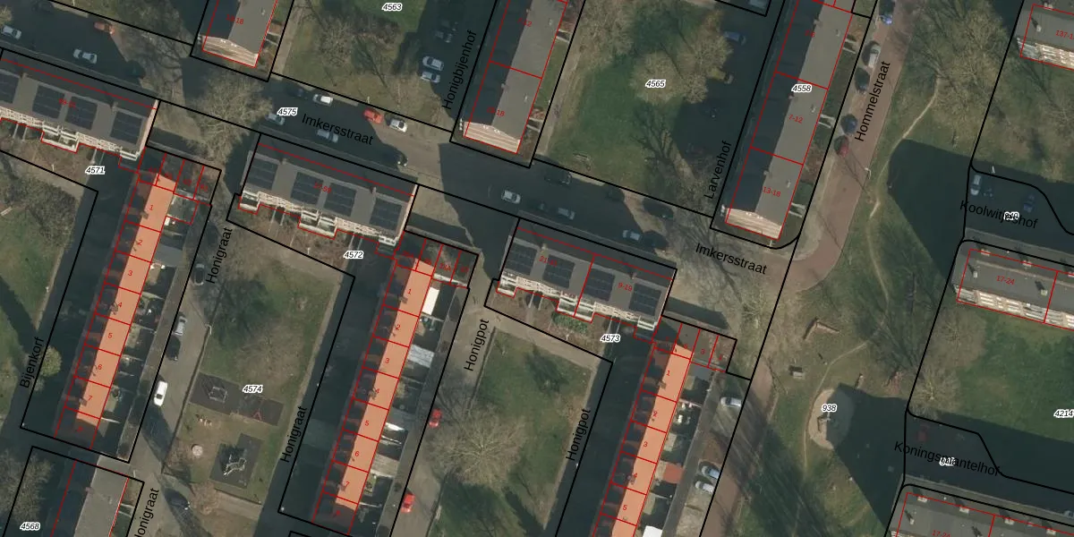 Het perceel waarop Imkersstraat 25 staat heeft een oppervlakte van 1941 m². Dit is een zeer groot perceel. De perceeloppervlakte wordt geregistreerd door het Kadaster. Gedetailleerde informatie over de maten van dit perceel kunt u vinden in het rapport Kadastrale kaart met maatvoering van Imkersstraat 25.