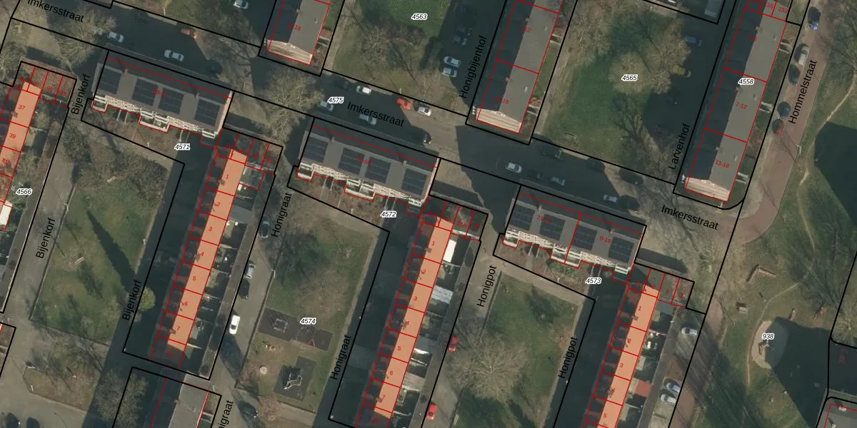 Het perceel waarop Imkersstraat 35-A staat heeft een oppervlakte van 1712 m². Dit is een zeer groot perceel. De perceeloppervlakte wordt geregistreerd door het Kadaster. Gedetailleerde informatie over de maten van dit perceel kunt u vinden in het rapport Kadastrale kaart met maatvoering van Imkersstraat 35-A.