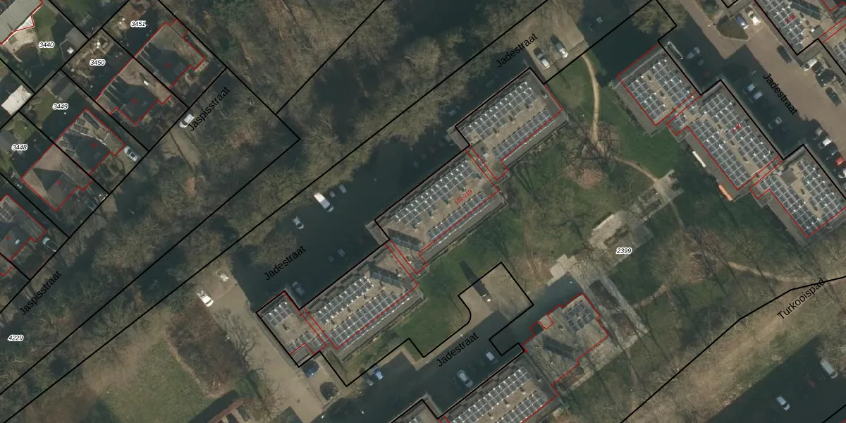 Het perceel waarop Jadestraat 169 staat heeft een oppervlakte van 9880 m². Dit is een zeer groot perceel. De perceeloppervlakte wordt geregistreerd door het Kadaster. Gedetailleerde informatie over de maten van dit perceel kunt u vinden in het rapport Kadastrale kaart met maatvoering van Jadestraat 169.