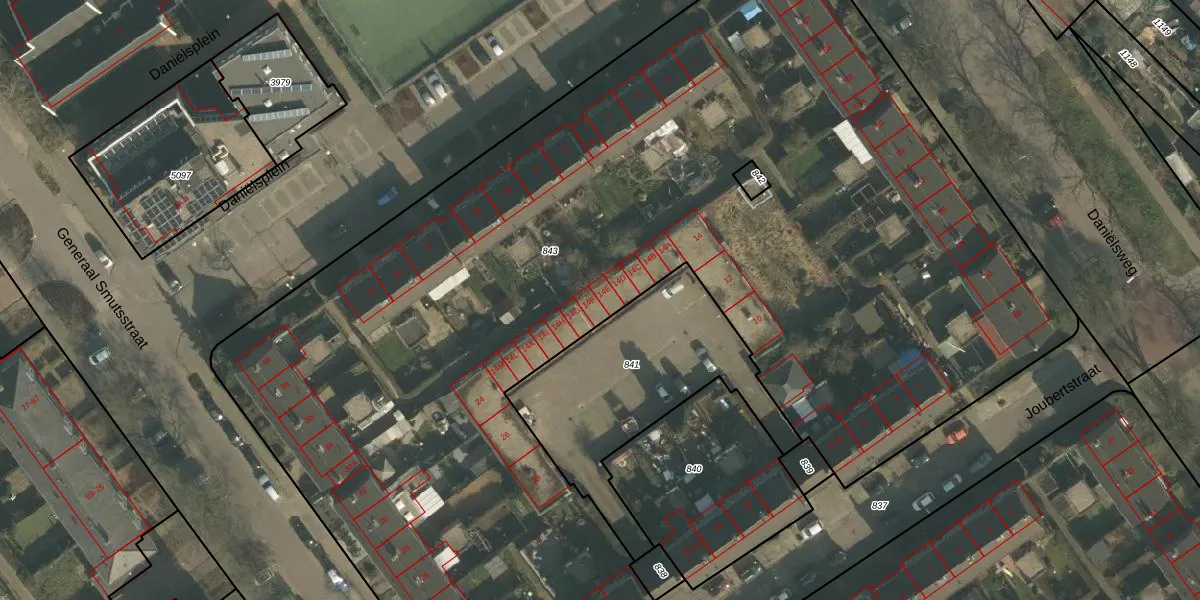 Het perceel waarop Joubertstraat 14-E staat heeft een oppervlakte van 8110 m². Dit is een zeer groot perceel. De perceeloppervlakte wordt geregistreerd door het Kadaster. Gedetailleerde informatie over de maten van dit perceel kunt u vinden in het rapport Kadastrale kaart met maatvoering van Joubertstraat 14-E.