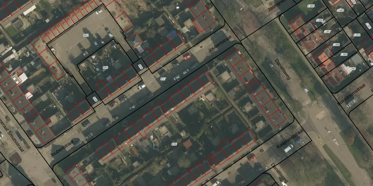 Het perceel waarop Joubertstraat 5 staat heeft een oppervlakte van 6490 m². Dit is een zeer groot perceel. De perceeloppervlakte wordt geregistreerd door het Kadaster. Gedetailleerde informatie over de maten van dit perceel kunt u vinden in het rapport Kadastrale kaart met maatvoering van Joubertstraat 5.
