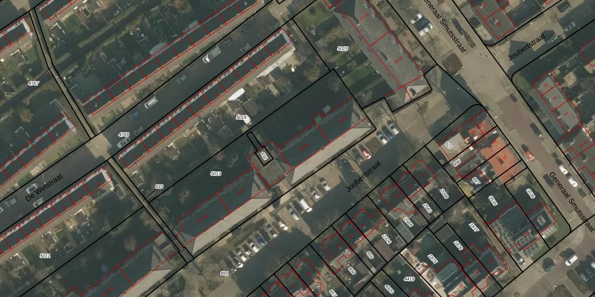 Het perceel waarop Joubertstraat 56 staat heeft een oppervlakte van 1835 m². Dit is een zeer groot perceel. De perceeloppervlakte wordt geregistreerd door het Kadaster. Gedetailleerde informatie over de maten van dit perceel kunt u vinden in het rapport Kadastrale kaart met maatvoering van Joubertstraat 56.